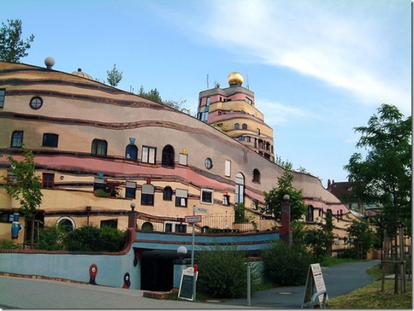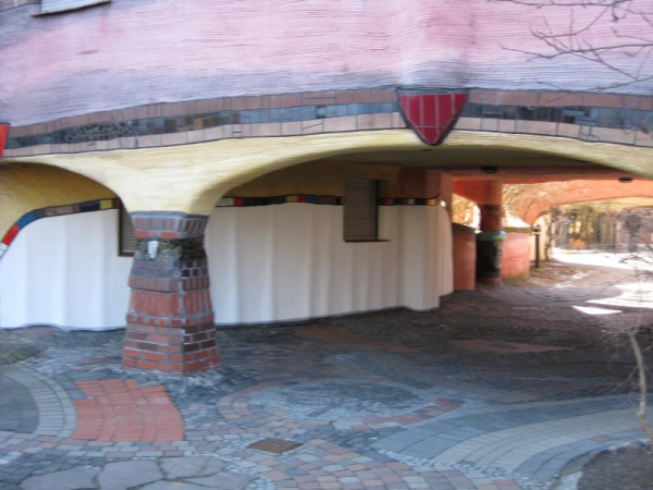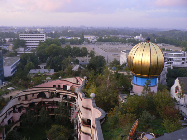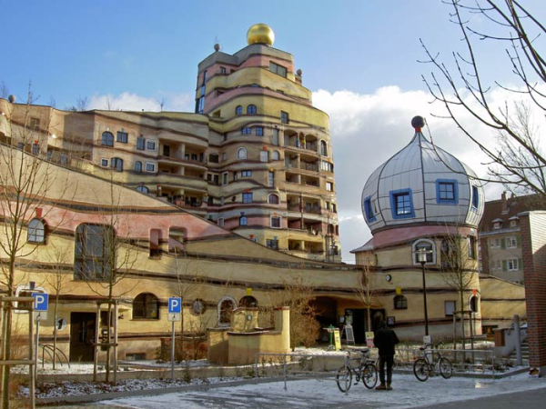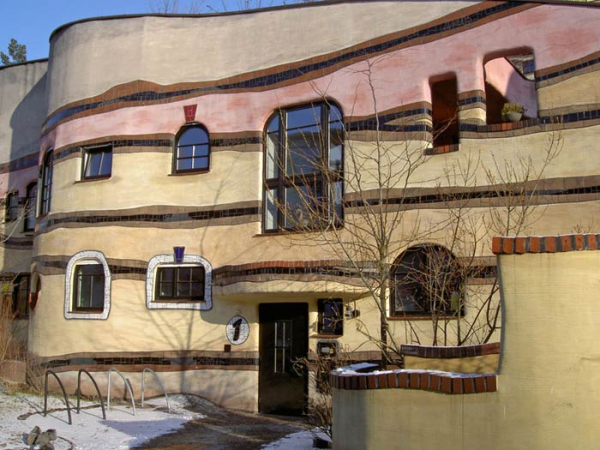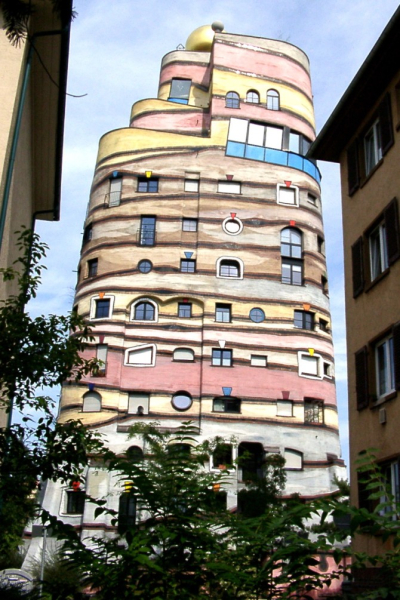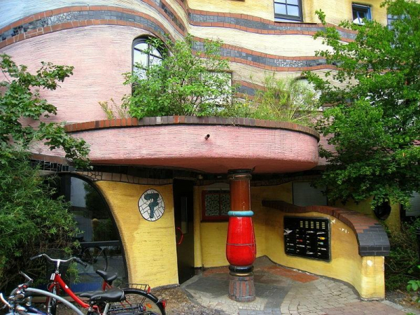Второе название (Waldspirale — лесная спираль) довольно точно описывает внешность домика: улиткообразный подъем крыши усажен зеленью – деревьями и кустами. Во дворике – пруд, лягушки квакают. И вообще в этом доме жить весело – наклонные полы и потолки, расписные стены, башенка с куполом. В этом чудо-здании действует правило вытянутой руки – куда из окошка может дотянуться жилец, там он может делать что угодно – рисовать, наклеивать, писать и самовыражаться любым доступным способом.