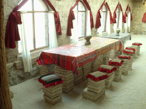 В ресторане отеля готовят фирменные блюда на основе мяса ламы, ягненка и, конечно же, соли. Есть еще паб с игровой комнатой (шахматы, бильярд) и кинотеатр на 40 мест.